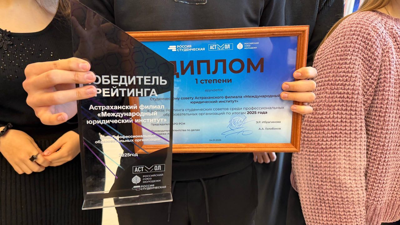 Астраханский филиал Международного юридического института не остался не замеченным и Совет студенческого самоуправления АФ МЮИ был удостоен дипломом I степени и памятной стелой Победителя рейтинга среди профессиональных организаций города.