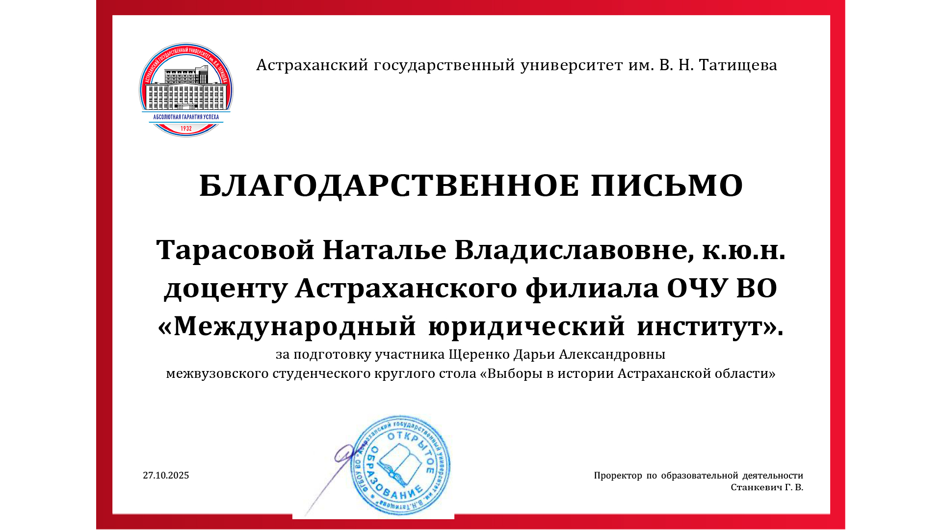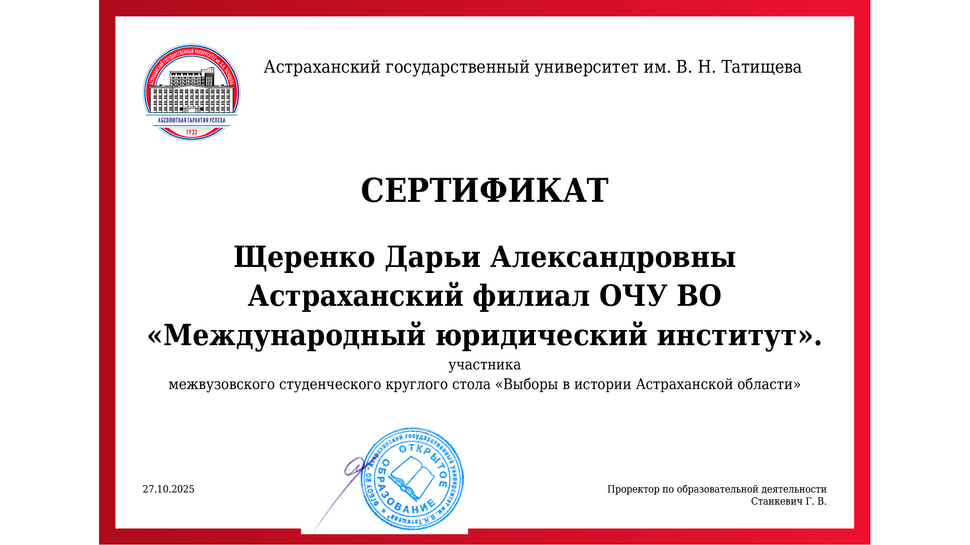 27 октября 2025 года в Астрахани, в атмосфере живого диалога, прошел межвузовский круглый стол «Выборы в истории Астраханской области», организованный Центром избирательного права и процесса совместно с региональной избирательной комиссией.